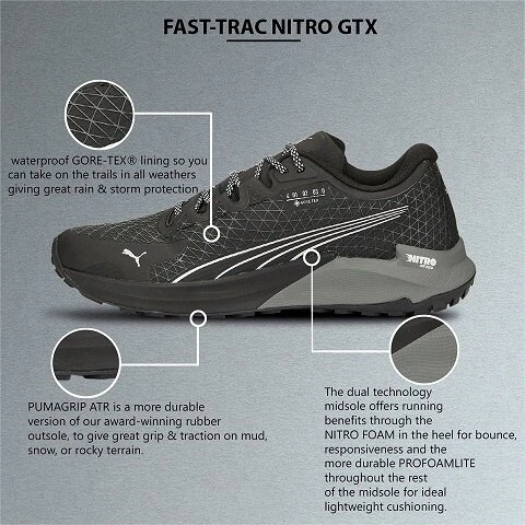 - dank der Dual-Foam-Zwischensohle – in der auf der gesamten Länge NITRO-Schaum und eine Schicht ProFoamLite miteinander kombiniert sind – und der strapazierfähigen PUMAGRIP ATR Außensohle ist er für jedem Untergrund geeignet, auch auf unbefestigten Wegen und Schotterstraßen.